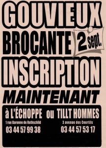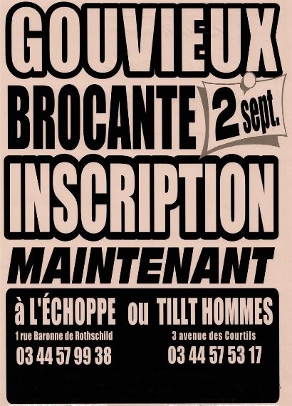 Les inscriptions pour la grande brocante 2018 de Gouvieux, l'une des plus grande de l'Oise, ont démarré ! Venez retirer vos bulletins au magasin l'Échoppe, rue Rotschild, ou à la boutique Tillt hommes, avenue des Courtils. Vous pouvez aussi télécharger votre bulletin sur le site : www.commercesdegouvieux.fr ou composer le au 03 44 57 53 17 et le 03 44 57 99 38. Alors, foncez ! La brocante c'est le 2 septembre 2018, et plus vous vous inscrivez tôt, plus vous pourrez choisir votre emplacement.